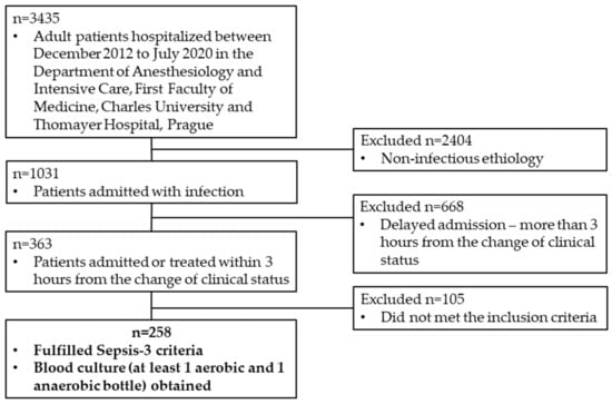 The following criteria were required for study inclusion: (1) Fulfilled criteria according to the Sepsis-3 definition. (2) Available results of blood cultures (BC)—at least 1 aerobic and 1 anaerobic bottle drawn at the time of sepsis diagnosis. (3) Change in clinical status less or equal to 3 h prior to admission to ICU or start of sepsis treatment.