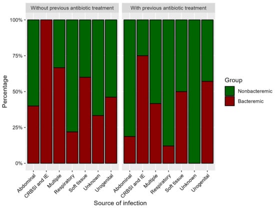 In the whole cohort, the highest percentage of bacteremia was observed in patients with CRBSI, IE, and soft tissue infection. In the subgroup of patients without previous antibiotics, CRBSI and IE (but not soft tissue infection) were the infections with the highest percentage of recorded bacteremia. Respiratory site of infection showed the lowest proportion of documented bacteremia in the whole cohort, as well as in the subgroup without previous antibiotic treatment, which was statistically significant.