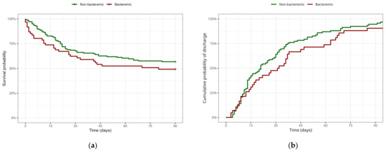 Kaplan-Meier model of survival (a) and ICU length of stay (b) in bacteremic and nonbacteremic groups.