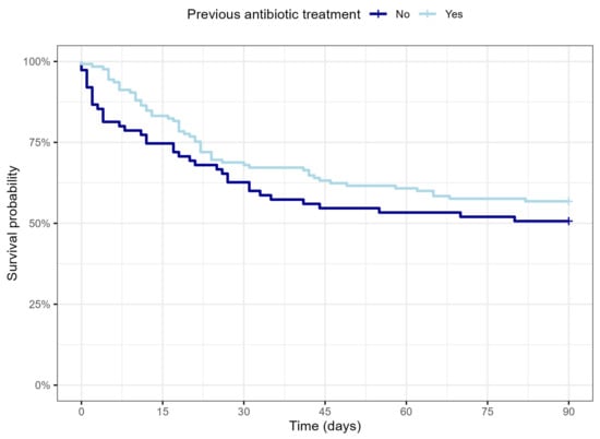 Kaplan-Meier survival analysis in patients with and without previous antibiotic treatment.