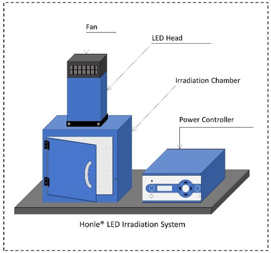 The LED irradiation system (Honle®, LED Cube 100 IC) was acquired from Panacol-USA, Inc. (Torrington, CT, USA). The LED system consisted of (i) an electronic power controller (Part #: 81621), (ii) an irradiation chamber with a reflective interior wall structure (Dimensions: 18 cm × 18 cm × 18 cm [H × W × D]; Part #: 81630), and (iii) Honle® LED heads emitting light at 405 nm (Part #: 85689) and 460 nm (Part #: 85684). LED lamps were mounted on top of the irradiation chamber and connected to the power controller with LED power set to 100%, as shown in Figure 1. Both the chamber and light heads were equipped with fans to avoid overheating during treatments. The radiant power per unit of surface area (i.e., irradiance [mW/cm2]) for each LED head was determined using a hand-held Honle® UV-meter (Part #: 86001) coupled with a LED spectrum surface sensor (FS LED D2, Part #: 80434) positioned at 5 cm from the LED head.