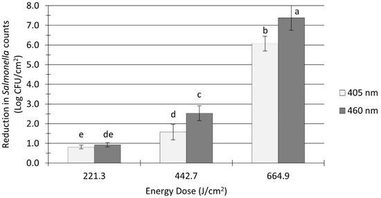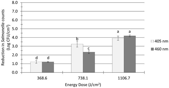 Triplicate data were analyzed with statistical package software SAS version 9.4 (SAS Institute, Cary, NC, USA), using a two-way analysis of variance (ANOVA) to compare the changes in Salmonella load on coupon surfaces in response to light wavelength and energy dose. ANOVAs were performed by using the GLIMMIX procedure of SAS. The LSMEANS procedure was used to calculate the mean and standard error of the various treatment replicates. Tukey’s multiple comparison test was used to determine significant differences in microbial reductions among treatments. All statistical analysis was performed with a significance level of p ≤ 0.05.