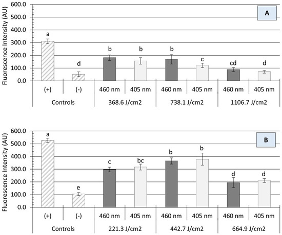 Production of intracellular reactive oxygen species (ROS) in Salmonella cells after the application of ultra-high irradiance blue light (405 and 460 nm LEDs) treatments on dry stainless steel surfaces with (A) and without (B) the presence of organic matter (wheat flour). The data are presented as mean ± standard deviation (n = 6). Fluorescence intensity values, within the same figure panel, with different letters are significantly different from one another (p ≤ 0.05). Negative control (−): untreated Salmonella cells; positive control (+): Salmonella cells treated with 200 mM H2O2.