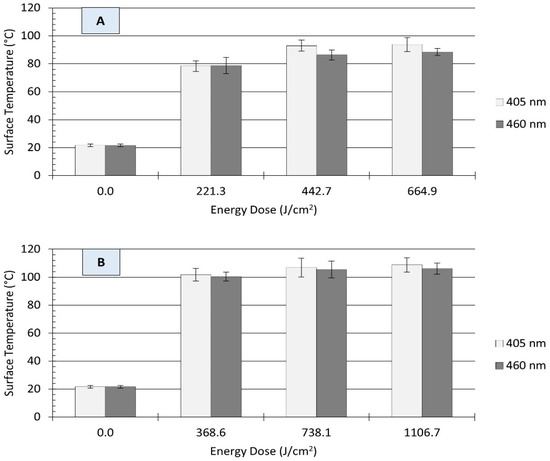 Surface temperature of unsoiled (A) and soiled/flour-coated (B) stainless steel (type 304) coupons as affected by ultra-high irradiance blue light treatments at 405 and 460 nm. Error bars denote ± standard deviation. Surface temperature was captured with a thermographic camera immediately after treatment.