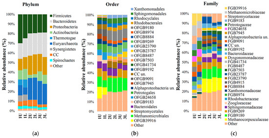Taxonomic profiles of the microbiome from the substrate before incubation time, at 5 retention days, and at 10 retention days using 16S rRNA gene sequencing data. Current level: (a) Phylum; (b) Order; (c) Family. 1U and 1L were taken before incubation at the bioreactor, and 2U, 2L, 3U, and 3L were taken during methane synthesis.