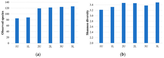 Diversity of microorganism species before stage (1U and 1L), when ORL was 2.44 kg VS/d of bioreactor (2U and 2L), and when ORL was 1.09 kg VS/d of bioreactor (3U and 3L): (a) alpha diversity analysis based on observed species diversity and (b) Shannon diversity.
