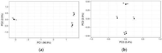 Principal Coordinate Analysis of microbiota before stage (1U and 1L), when ORL was 2.44 kg VS/d of bioreactor (2U and 2L), and when ORL was 1.09 kg VS/d of bioreactor (3U and 3L): (a) the similarity matrix of microbiota in coordinates PC1 and PC2 and (b) the similarity matrix of microbiota in coordinates PC3 and PC2.