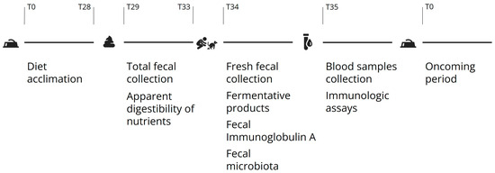 The study lasted a total of 140 days, and each period took 35 days: the first 28 days were intended for diet acclimation, and the following 7 days were destined for sample collection. From days 29 to 33, total fecal samples were collected to measure ADC. On day 34, fresh feces were aseptically placed into 2 mL vials and immediately frozen at −80 °C for later determination of fecal microbiota, fermentative products, and IgA. Finally, on day 35, 10 mL blood samples were collected from the jugular venipuncture for immunological variable analyses and measured on the same day (Figure 1).
