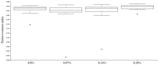 Among the results obtained by sequencing the animals’ fecal microbiota and bioinformatics analysis, no differences were found in alpha diversity when analyzing Faith’s phylogenetic diversity (p = 0.1414; Figure 2) and Pielou-evenness indexes (p = 0.1151; Figure 3).