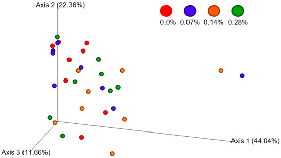 The determination of beta diversity, evaluated using the 3D principal coordinate analysis performed using the QIIME program version 2022.9 (Figure 4), showed a grouping of experimental treatments between the axes, which assumes a brief taxonomic variation between the four groups. However, it was possible to observe taxonomic variability between the intestinal microbiome after 0.0 and 0.14% BG consumption (p = 0.047).