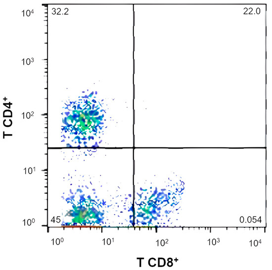The helper T lymphocytes (CD4+), cytotoxic T lymphocytes (CD8+), and the CD4+:CD8+ ratio were evaluated. Mononuclear cells (2 × 105 cells/mL) were incubated in microtubes (1.5 mL) with CD3+ (1:100) and CD4 (1:10) antibodies (Biolegend, San Diego, CA, USA), diluted in 100 µL of buffer for cytometry (PBS containing 0.5% bovine serum albumin and 0.02% sodium azide). Isotype antibodies were included in the assay to define the negative region (background). Cells were incubated for 20 min at 4 °C, protected from light. After the end of the incubation period, the samples were washed twice with buffer for cytometry in a volume of 1000 µL per microtube. Finally, the cells were resuspended in 500 µL of PBS. Cells with low size (FSC) and low complexity (SSC) were selected as lymphocyte populations, according to the delimited gate. From this selection, the different populations of lymphocytes were determined. The acquisition and analysis of 10,000 cells were performed using the FACS Calibur model flow cytometer (Becton Dickinson, San Jose, CA, USA). These determinations were carried out at the Comparative Immuno-oncology Laboratory at FMVZ/USP, located in Sao Paulo, SP, Brazil.