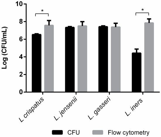 Quantification of bacterial concentrations of L. crispatus, L. jensenii, L. gasseri, and L. iners suspensions with an OD of 0.5 by culture-dependent (CFU) and -independent (Flow cytometry) techniques. The bars represent the mean and the standard deviation of 3 independent experiments. * Represents statistical significance (t-test paired samples, parametric, p ≤ 0.05).