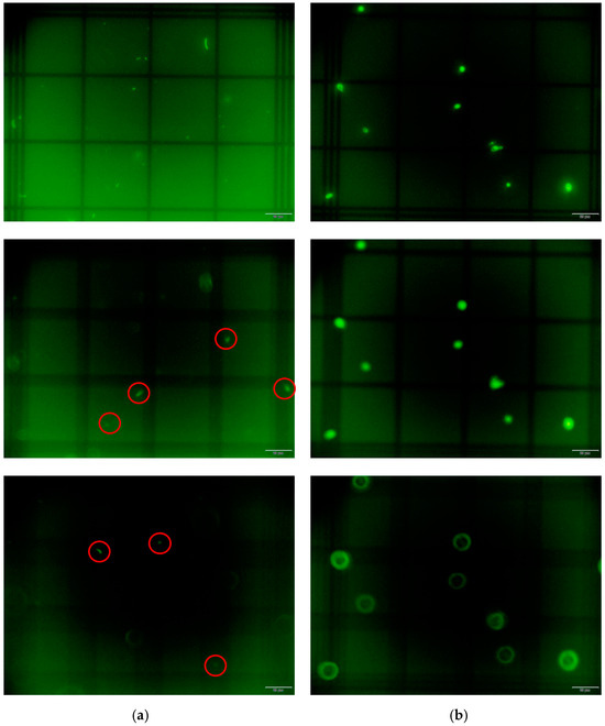 Comparison of the use of Neubauer chamber for (a) L. crispatus and (b) C. albicans using three z-stacks. The observation of these microorganisms was performed using fluorescence microscopy. For L. crispatus (a), the variation of focal points demonstrates different numbers of counts, while for C. albicans (b) the number of cells is the same for the three z-stacks. The red circles surround the bacteria that are not visible in the first focal plan. Scale bar: 20 µm.