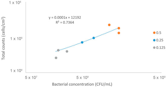 In order to overcome the above focal point limitation of the Neubauer chamber, we aimed to correlate the bacterial concentration contained in an equivalent volume used on the Neubauer chamber, after fixation on a regular microscopic slide. To validate this proof of principle, we selected an easily cultivable bacterial species, E. coli, that is known to be accurately quantified by CFUs [49]. Three different bacterial concentrations of E. coli, quantified by optical density, were used in this experiment. As shown in Figure 3, this method allowed for us to correlate the initial bacterial concentration (a 3D measurement), to a 2D bacterial measurement (surface area of the fixated suspension), thus allowing for us to use FM for bacterial culture concentration determination by eliminating the focal point limitation of the Neubauer chamber.
