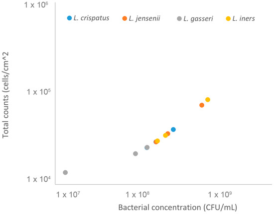 Lactobacillus spp. Concentrations obtained through total counts. Four bacterial suspensions adjusted to OD620nm = 0.5 were quantified by fluorescence microscopy and the results obtained were converted into CFUs, as mentioned above. The dots correspond to three independent assays for each Lactobacillus spp.