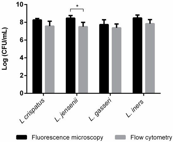 Quantification of bacterial concentrations of L. crispatus, L. jensenii, L. gasseri, and L. iners suspensions with an OD of 0.5, using fluorescence microscopy and flow cytometry techniques. The bars represent the mean and the standard deviation of 3 independent experiments. * Represents statistical significance (t-test paired samples, parametric, p ≤ 0.05).