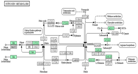 Snapshot of KEGG database showing nitrogen metabolism pathway in Mesorhizobium sp. PAMC28654. Enzymes available are highlighted in green.