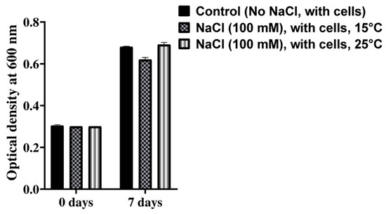 Salinity test of Mesorhizobium sp. PAMC28654 strain at two different temperatures of 15 °C and 25 °C. Black color represents control (No NaCl, with Mesorhizobium sp. PAMC28654 cells) and different filled pattern represents test (NaCl, with Mesorhizobium sp. PAMC28654 cells at 15 °C and 25 °C).