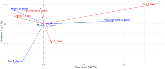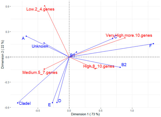 Correspondence analysis for number of virulence genes (blue arrows) and resistance to different antimicrobials (red arrows). Resistance groups were divided into low (strains are resistant to 1 to 3 of the antimicrobials tested), medium (resistant to 4 to 6 antimicrobials), high (resistant to 7 to 10 antimicrobials), and very high (resistant to 11 or more antimicrobials).