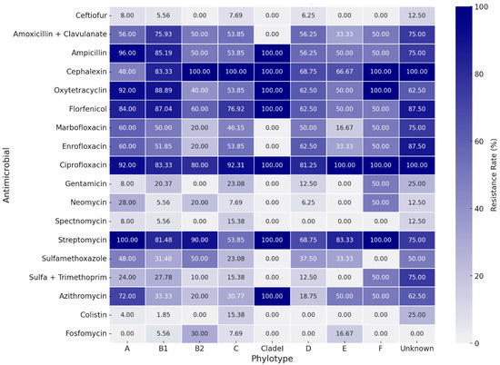 The tested strains of E. coli exhibited high resistance to several antimicrobials, including ciprofloxacin, streptomycin, cephalexin, florfenicol, tetracycline, and ampicillin. Some of these antimicrobials are commonly used in pig farming [47], including for the treatment of genitourinary infections. Similar results were found by Spindola et al. [10], who also observed high resistance of UPEC to tetracycline, florfenicol, and ampicillin, but sensitivity to ceftiofur, gentamicin, spectinomycin, and amoxicillin and clavulanic acid. In contrast, 65% of the strains in this study were resistant to amoxicillin and clavulanic acid.