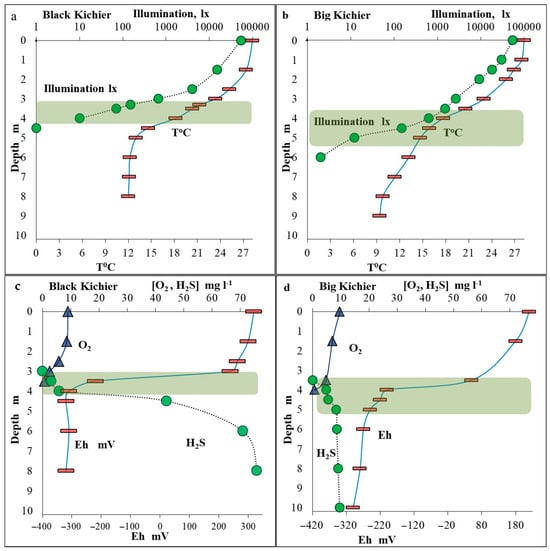 Temperature and illumination in the water column of the Black Kichier (a) and Big Kichier (b) lakes. Concentrations of oxygen and sulfide (mg L−1) and redox potential (mV) in the water column of the Black Kichier (c) and Big Kichier (d) lakes. Location of the bacterial plate is indicated by green shading.