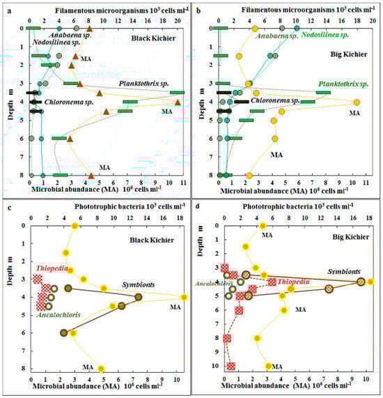Total microbial abundance (MA), 106 cells mL−1 (lower scale) and numbers of filamentous microorganisms (Anabaena sp., Nodosilinea sp., Chloronema sp., and Planktothrix sp.) (103 cells mL−1, upper scale) in the water columns of Black Kichier (a) and Big Kichier (b). MA, 106 cells mL−1 (lower scale) and abundance of Thiopedia, Ancalochloris, and symbionts, 103 cells mL−1 (upper scale) in the water columns of the Black Kichier (c) and Big Kichier (d) lakes.