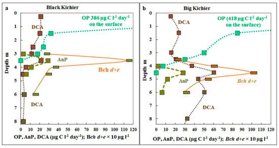 Rates of oxygenic (OP) and anoxygenic (AnP) photosynthesis and dark CO2 assimilation (DCA), µg C L−1 day−1 as well as bacteriochlorophyll d + e (Bch d + e, 10 µg L−1) in the water column of Black Kichier (a) and Big Kichier (b).