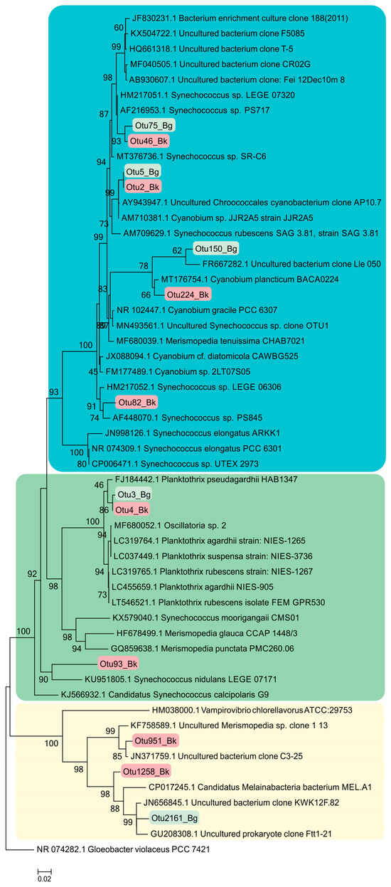 Phylogenetic position of the main members of the Cyanobacterota phylum according to the results of high-throughput sequencing of the 16S rRNA gene fragments in the Black Kichier (Bk) and Big Kichier (Bg) lakes.