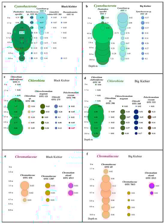 Distribution of cyanobacteria (a,b), Chlorobia (c,d), and Chromatiaceae (e,f) (OTU, %) in the water column of the Black and Big Kichier lakes.
