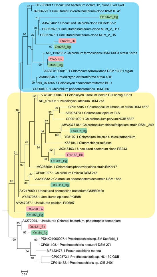 Phylogenetic positions of the main members of the class Chlorobia according to the results of high-throughput sequencing of the 16S rRNA gene fragments in the Black Kichier (Bk) and Big Kichier (Bg) lakes.