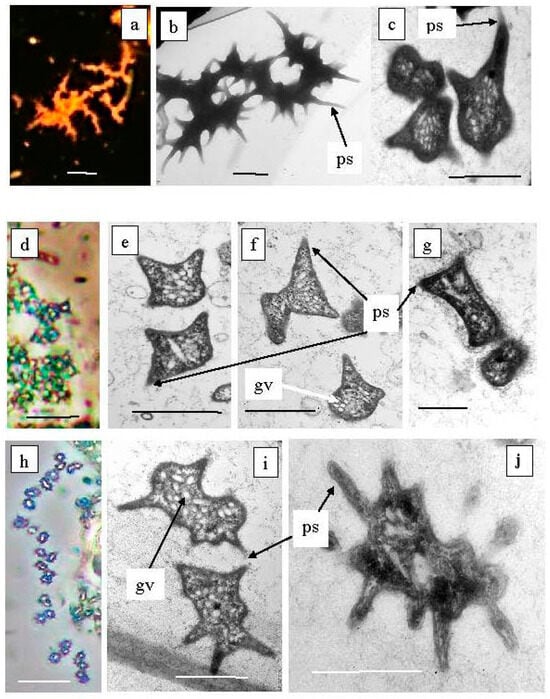 Green sulfur bacteria of unusual morphology living in the Black Kichier lake. Note: (a) fluorescent microscope; (d,g) light microscope phase contrast. Electron microscope: (b) total cells; (c,e–g,i,j) ultrathin sections; ps—prosteke; gv—gas vesicles; Ancalochloris perfilievii (a–c) forming long streaks; Ancalochloris perfilievii form 1, angular irregular shape (d–f); Ancalochloris sp. form 2, Prosthecochloris of similar morphology (h–j); Chlorobium clathratiforme (g). Magnification (bar): (a,d,h) 5 µ; (b,c,e–g,i,j) 1 µ.