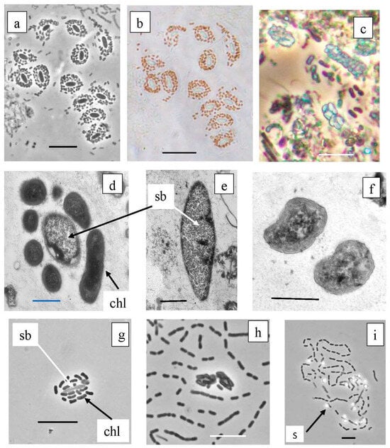 Symbiotic consortia from the chemocline of Black Kichier lake. Note: (a,c,g,h) light microscope, phase contrast; (b) light microscope, bright field; (d–f) TEM, ultrathin sections. Magnification (bar): (a–c,g,h,i) 5 µ; (d–f) 0.5 µ; (a,b) Pelochromatium roseum, (c) Chlorochromatium magnum, (d) unidentified consortium; (f) Chlorobium sp., (g,h) consortium GSB from enrichment cultures. (i) Free living GSB form chains of cells, oxidize sulfide to sulfur deposition; sb—Simbiobacter sp.; chl—Chlorobium sp.; s—sulfur.
