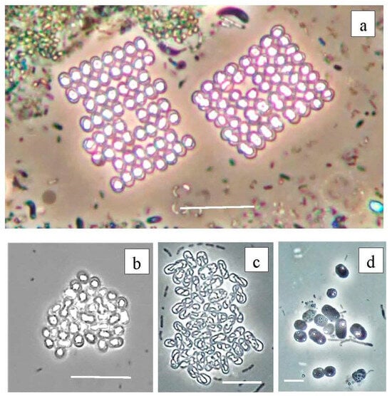 Purple bacteria of the Black Kichier lake. Note: light microscope: (a) bright field, (b–d) phase contrast; (a) natural sample from chemocline zone, (b–d) enrichment culture. (a) Thiopedia rosea, (b) Thiocapsa rosea, (c) Thiodictyon elegans, (d) Chromatium sp. Magnification (bar): (a,b) 10 µ; (c) 5 µ; (d) 2 µ.