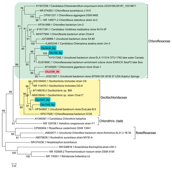 - Keppen, O.I.; Tourova, T.P.; Kuznetsov, B.B.; Ivanovsky, R.N.; Gorlenko, V.M. Proposal of Oscillochloridaceae fam. nov. on the basis of aphylogenetic analysis of the filamentous anoxygenic phototrophic bacteria, and emended description of Oscillochloris and Oscillochloris trichoides in comparison with further new isolates. Int. J. Syst. Evol. Microbiol. 2000, 50, 1529–1537. [Google Scholar] [CrossRef]