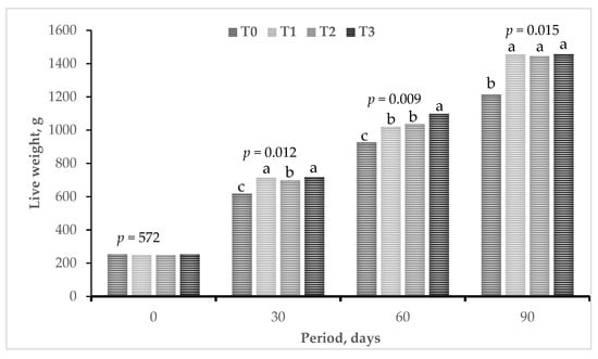 Experimental data were processed with the statistical package Statgraphics plus ver. XV. II for Windows. Experimental variables such as weight gain, relative weight of digestive tract organs and microbial load (CFU·mL−1) obtained in the culture media were subjected to a simple rank analysis of variance (ANOVA) according to a completely randomized design [33]. When the p-value was p < 0.05, a Duncan [34] comparison test was applied to discriminate differences between treatments.