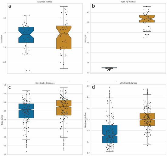 The calculation α-diversity was performed using Shannon diversity and Faith’s phylogenetic distance [12,15]. β-diversity was computed using both Bray–Curtis dissimilarity and the weighted UniFrac methods [14,16]. α-diversities were calculated using reads classified using Kraken2 with the genus-level custom database. β-diversities were computed upon all classified reads and normalized by geometric means, as in DESeq2 (v1.42.0) [24]. All calculations were performed at the species level. The significance of the differences was evaluated using Mann–Whitney U statistical tests and p-values adjusted by False Discovery Rate correction with the Benjamini–Hochberg method.
