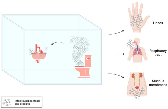 In the context of shared toilets, bioaerosols can play an important role in the transmission of infections. When a toilet is flushed, a turbulent flow of water generates aerosols and droplets that can carry microorganisms and spores from faecal matter both into the air and the surrounding environment [12,15,36].