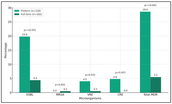 Methicillin-resistant Staphylococcus aureus (MRSA) was identified in one case in the full-term group (0.5%) and none in the preterm group, but the difference was not statistically significant (p-value = 0.405). When considering the total incidence of MDR organisms, the preterm group had a significantly higher rate (28.6%) compared with the full-term group (5.5%), with a p-value of less than 0.001, as seen in Table 4 and Figure 1.