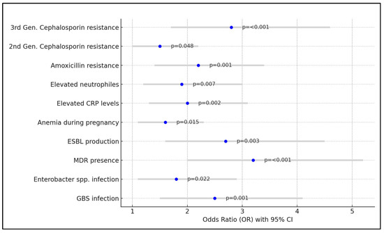 Other medical conditions during pregnancy, like anemia and elevated C-reactive protein (CRP) levels, were associated with increased odds of preterm birth, with ORs of 1.6 and 2.0, respectively. Elevated neutrophile count was similarly associated, with an OR of 1.9. Antibiotic resistance patterns also significantly impacted the risk, with amoxicillin resistance, second-generation cephalosporin resistance, and third-generation cephalosporin resistance having ORs of 2.2, 1.5, and 2.8, respectively, all indicating an increased risk of preterm birth, as presented in Table 6 and Figure 2.