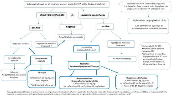 - Screening of women at risk of STI should be performed at the first prenatal care visit by a vulvovaginal swab for N. gonorrhoeae and C. trachomatis [22,23]. Swabs should be repeated in the third trimester in the case of ongoing exposure to risk (i.e., women with multiple sexual partners, previous STI, or coming from areas with a high prevalence of the disease such as Eastern Europe, South East Asia, Africa and Latin American countries). Women without risk factors who have not been swabbed during pregnancy and who have been regularly followed-up with by the obstetrician are to be considered negative.