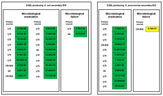 Microbiological outcomes were defined as eradication whenever the index pathogen was undetectable at the follow-up blood cultures, and, in contrast, as failure whenever the index pathogen was still detectable at the follow-up blood cultures (breakthrough BSI).