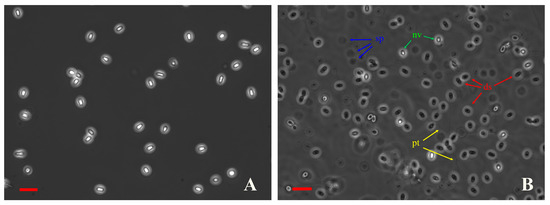 Discharged and undischarged N. bombycis spores look dark and light, respectively, in phase-contrast optics. (A) Intact spores without polar tube extrusion stimulation. (B) Control (untreated with antiseptics) spores after polar tube extrusion stimulation. ds—discharged spores, nv—non-viable spores, sp—sporoplasms, and pt—polar tubes. Scale bars 10 µm.