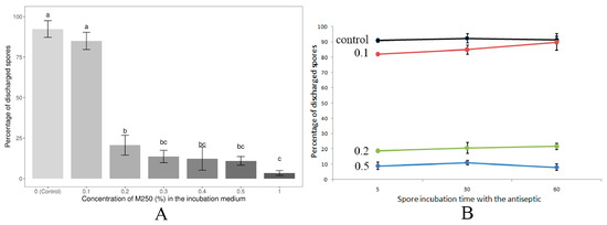 Dependence of N. bombycis spore viability (percentage of discharged spores) on M250 concentration (A) and incubation time (B). (A) Data from three independent experiments were analyzed. Bars represent the mean ± standard error. Different letters indicate statistically significant differences between groups analyzed by one-way ANOVA followed by Tukey’s post hoc test. The adjusted p-value for the difference between samples is less than 0.00001 for groups a and b, and a and c, and less than 0.01 for groups b and c. Double letters (bc) indicate that the values in these samples are not significantly different from b and c, but are different from a. (B) Control—spores without M250 treatment; 0.1, 0.2 and 0.5—the M250 content (%) in the incubation medium. Data are presented as the mean of three replicates ± standard error.