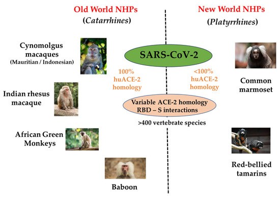 Pictorial representation of the major NHP species used to evaluate different aspects of SARS-CoV-2 species. Outcomes of virus pathogenesis and treatment outcomes, including vaccines, were modelled predominantly in Old World NHPs, where the homology between the primary virus/host receptor (ACE-2) is 100%, though different outcomes exist amongst different species.