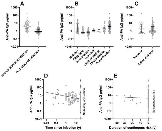 Factors indicated as likely correlates with anti-PA IgG concentration in a multiple regression. Potential roles are shown for confirmed previous anthrax infection (panel A), different occupational groups (panel B), residence in Arpaçay district (panel C), time interval between infection and sampling (panel D), and duration of continuous exposure risk (panel E). Each data point represents one individual. For categorical variables, median +/− interquartile ranges are given. For continuous variables, a regression line indicates the direction of effect.