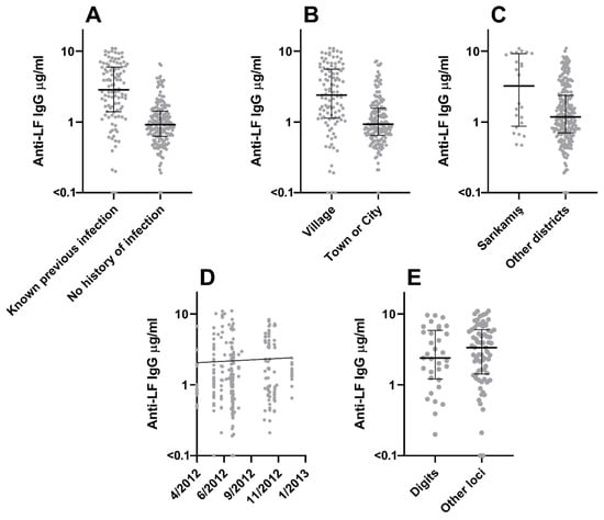 Time since infection (Figure 1D) was negatively associated (p = 0.013), and duration of continuous risk of exposure (Figure 1E) positively associated (p = 0.024) with anti-PA IgG concentration. Town residence was negatively associated (p = 0.012) with anti-PA IgG concentration, while village residence was positively associated (p < 0.001) with anti-LF IgG concentrations. Individuals from Arpaçay district (Figure 1C) had relatively elevated (p = 0.024) anti-PA IgG concentrations, while those from Sarıkamış district (Figure 2C) had relatively elevated (p < 0.001) anti-LF IgG concentrations.