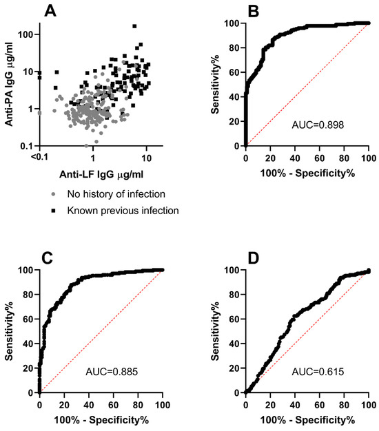 A composite discriminant factor optimised for identifying previous infection, that used corresponding values for both antibody concentrations, was then derived. This discriminant factor could predict previous infection with good sensitivity and specificity as demonstrated by its Receiver Operator Characteristic (ROC) curve, which had an AUC of 0.898 (Figure 3B). This provided only a slight increase in predictive accuracy compared to anti-PA IgG concentration alone, which had an AUC of 0.885 (Figure 3C). In contrast, the minor contribution made by anti-LF IgG concentration to the composite discriminant factor is demonstrated by its ROC curve, which had an AUC of only 0.615 (Figure 3D).