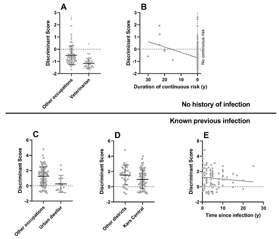 The results of the stepwise multiple regression analysis using only data from individuals with known previous anthrax infection together with the discriminant factor are shown in Table S6. They indicate that, amongst the previously infected group, antibody concentration profiles least typical of past infection were significantly associated with the occupational group of urban dwellers (p = 0.007, Figure 4C), residence in Kars Central district (p = 0.035, Figure 4D), and increasing time since infection (p = 0.038, Figure 4E).