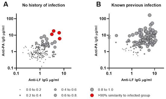 Probability of membership of past infection group as assessed by linear discriminant analysis. Corresponding anti-PA IgG (y-axis) and anti-LF IgG (x-axis) concentrations are shown for individuals with no history of infection in (Panel A) and those with known previous infection in (Panel B). The probability of belonging to the known previous infection group, as determined by linear discriminant analysis, is indicated for each individual by the size of circles in (Panels A and B).
