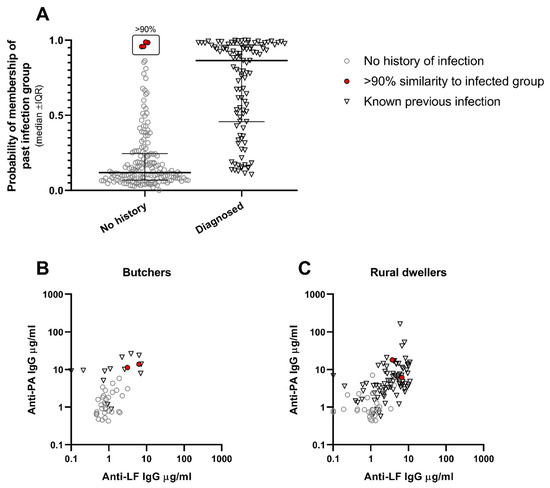 Evidence of undiagnosed previous cases of anthrax infection within the dataset. (Panel A) shows the likelihood of belonging to the group with known previous infection, as calculated by linear discriminate analysis. This discriminate analysis used concentrations of anti-PA and anti-LF IgG antibodies to ascertain optimal values to determine whether an individual had previously had an anthrax infection. Four individuals with no recorded history of anthrax had antibody concentrations indicating a >90% probability of previous infection. Two were butchers and two were rural dwellers (Table S7). Their results for both anti-PA and anti-LF IgG concentrations are shown together with all other individuals in their occupations, both with and without history of prior anthrax infection ((Panel B) for butchers, (Panel C) for rural dwellers).